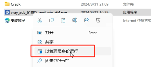 2、打开解压后的文件夹,选择 vray_adv_61005_revit_win_x64.exe 右键以管理员身份运行安装程序