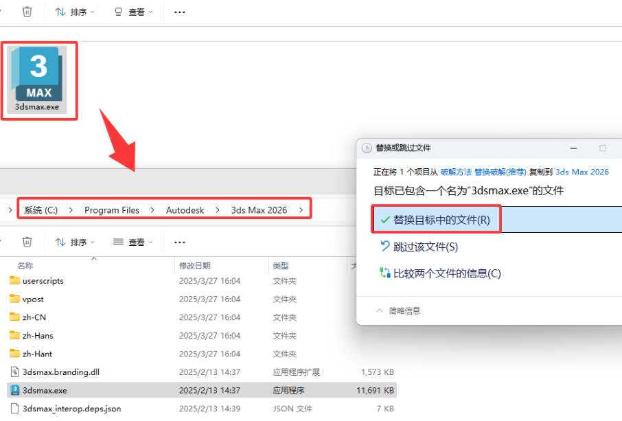 将“3dsmax.exe”文件【替换】到3Dmax软件的安装目录中;安装目录查看第三步;或者桌面图标右键“打开文件所在位置”