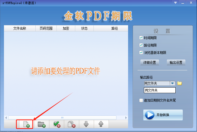 2、点击箭头所指按钮,添加单个文件,选择您需要的PDF文件,添加至软件
