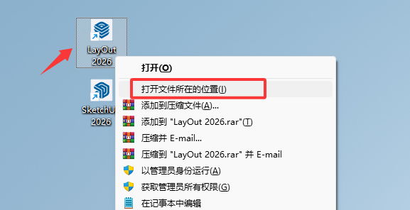 6、在桌面上的LayOut2026图标鼠标右键>打开文件所在的位置
