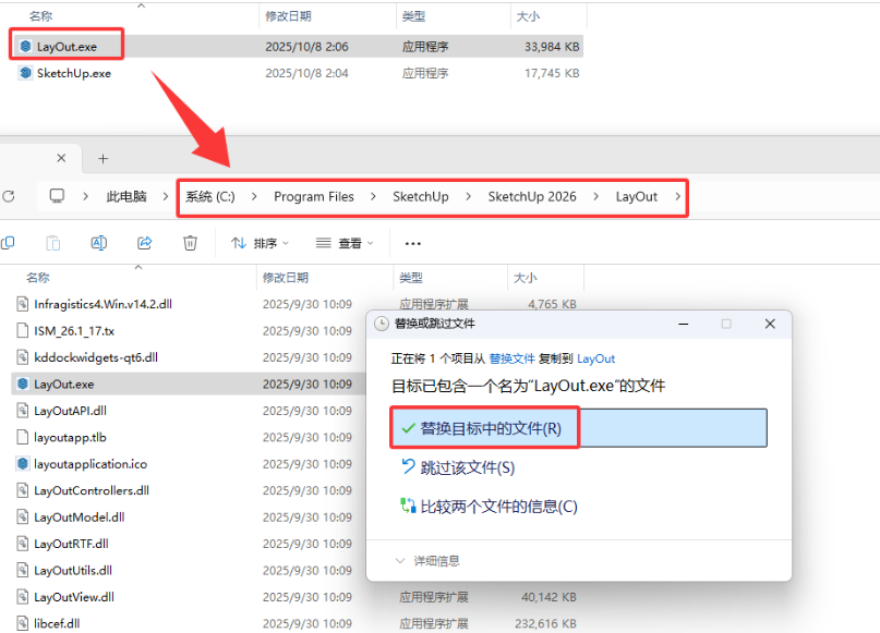 7、将替换文件夹中的:LayOut.exe替换到刚刚右键打开的文件夹所在位置,默认路径是C:\ProgramFiles\SketchUp\SketchUp2026\LayOut