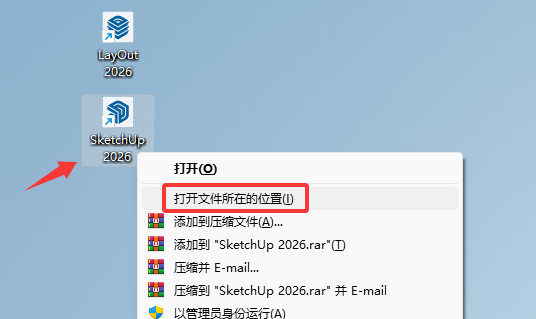 8、在桌面上的SketchUp2026图标鼠标右键>打开文件所在的位置