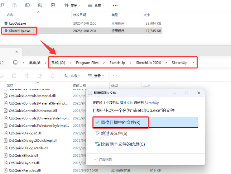 9、将替换文件夹中的:SketchUp.exe替换到刚刚右键打开的文件夹所在位置,默认路径是C:\ProgramFiles\SketchUp\SketchUp2026\SketchUp