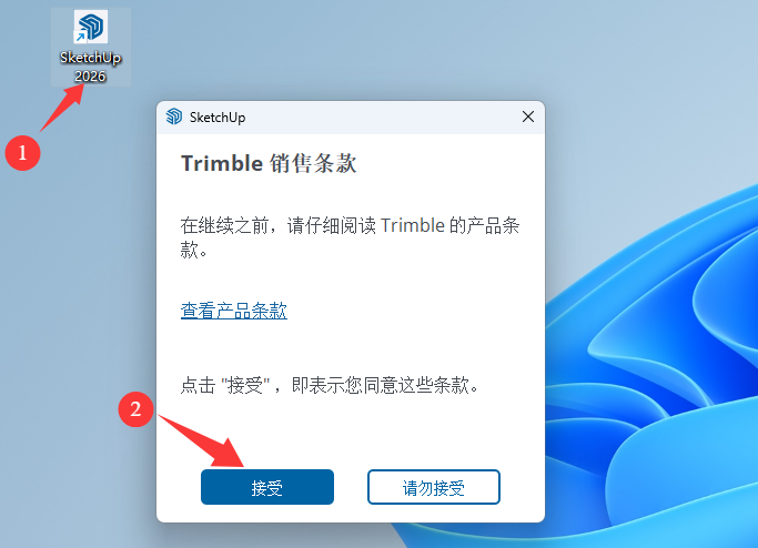 10、首次运行SketchUp2026后弹窗点击“接受”