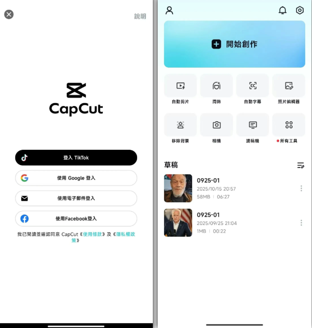 它功能丰富实用,涵盖自动剪片、自动字幕、照片编辑、移除背景、相机拍摄、速度调节、视频拼接等。