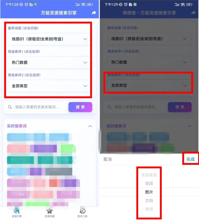 初始设置:安装并启动软件后,界面布局清晰合理。顶部提供多种搜索线路(引擎)供用户选择,以满足不同的搜索需求;下方的筛选条件区域功能丰富,用户可根据自身偏好选择最新资源、热门资源等,还能精确限定资源类型,如视频、音频、图片等,实现精准搜索。
