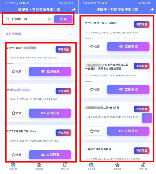 关键词搜索:输入目标关键词,软件将迅速在海量资源中进行筛选和匹配。以 “计算机二级” 为例,搜索结果将呈现大量相关学习资料,涵盖历年真题、教学视频等,为用户提供全面的信息支持。